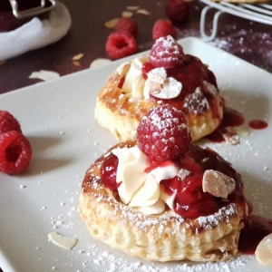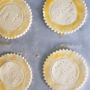 - Koristila sam listove već razvaljanog lisnatog tijesta koje sam izrezala okruglim kalupom, pritisnula još jednu unutarnju kružnicu sa čašom, ali ne do kraja i rubove premazala jajetom.Sredinu kruga tijesta izbodite vilicom i pecite na 200°C dok ne dobije lijepu zlatnu boju. Ako se sredina tijesta dignula lagano je pritisnite čašom da dobijete udubljenje za kremu.Košarice ostavite da se dobro ohlade.