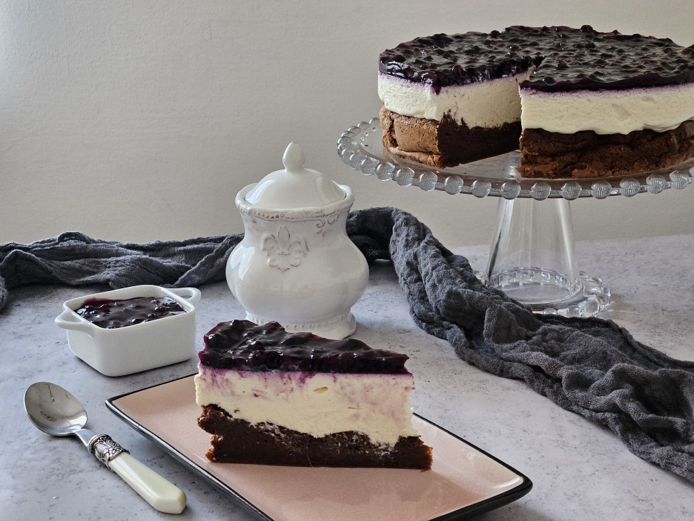 Danas dijelim s vama recept za ovu jednostavnu tortu koja je prožeta iznimnim okusima. Čokoladni mekani biskvit, sloj glatkog krem sira i svježina borovnica zadovoljit će sve vas ljubitelje voćnih deserata!